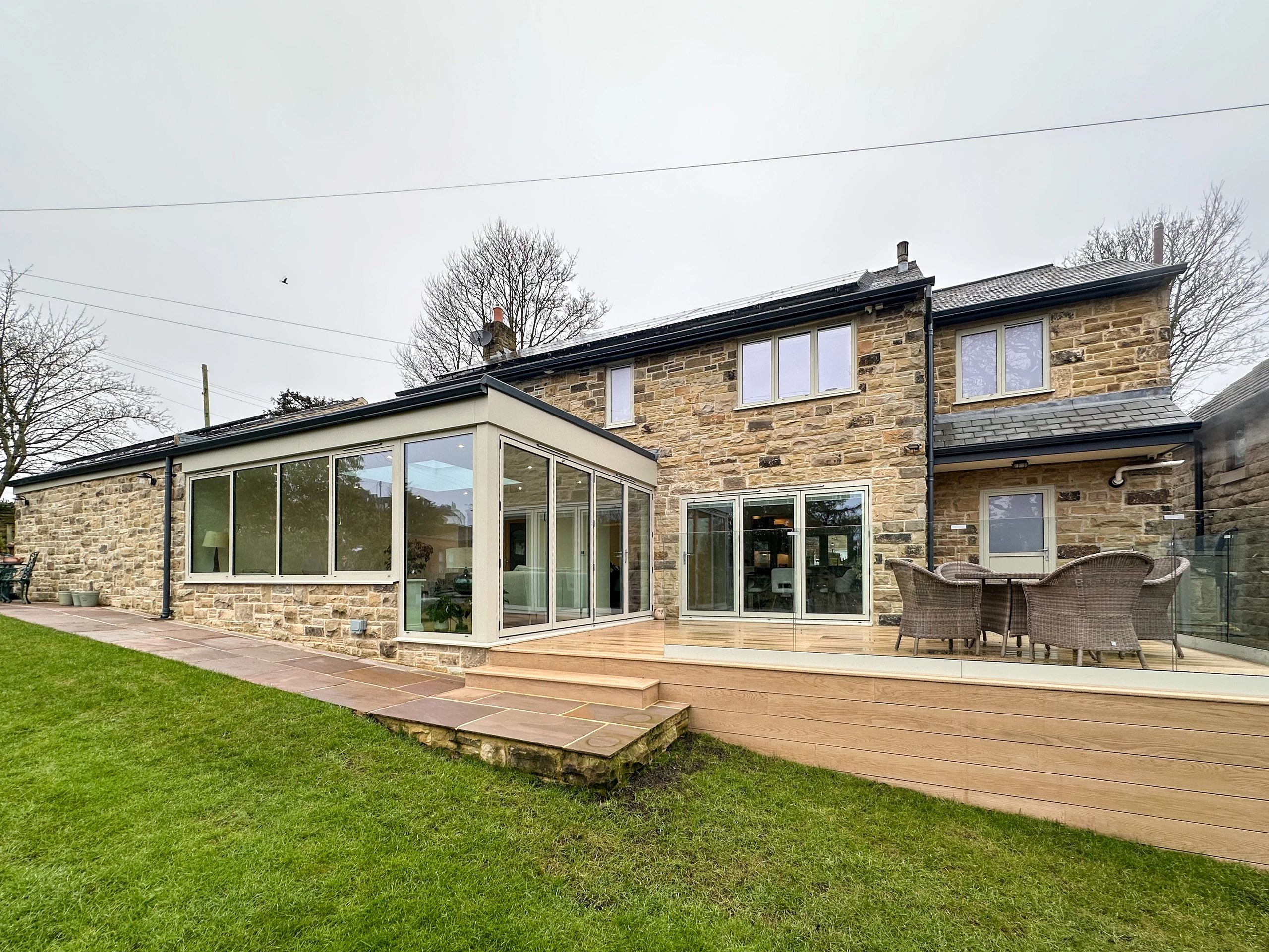 Feature corner window for a modern sunroom, new kitchen and double garage with underfloor heating throughout, solar pannels and new aluminium windows and doors.