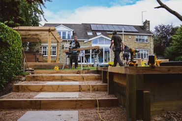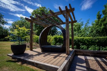 Thorp Arch client wanted to make the most out of her south facing garden by incorporating a seating area, fire pit and hot tub, all built out of solid oak by Bowe Joinery & Developments Ltd.